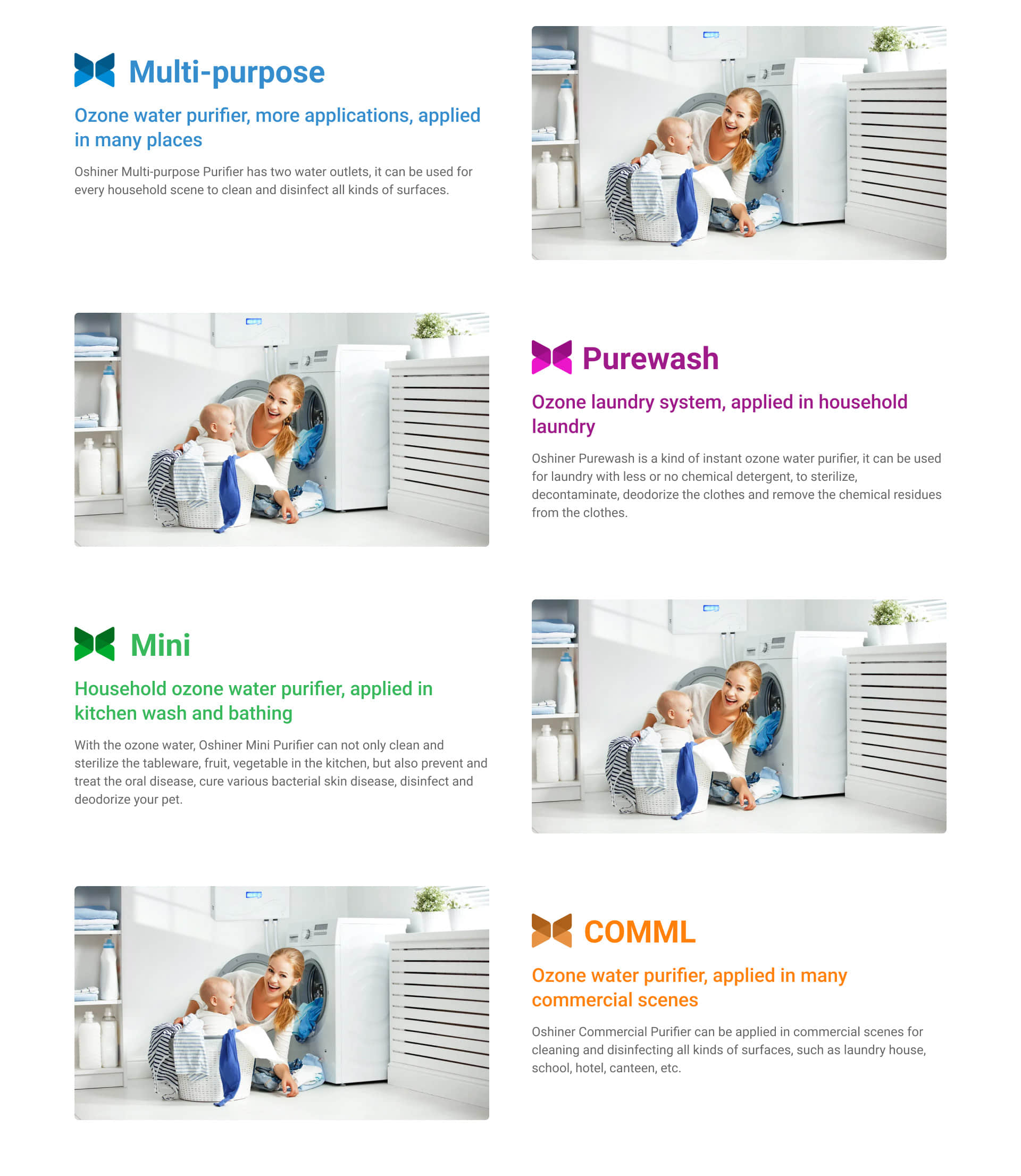 Oshiner Purewash is a kind of instant ozone water purifier, it can be used for laundry with less or no chemical detergent, to sterilize, decontaminate, deodorize the clothes and remove the chemical residues from the clothes.